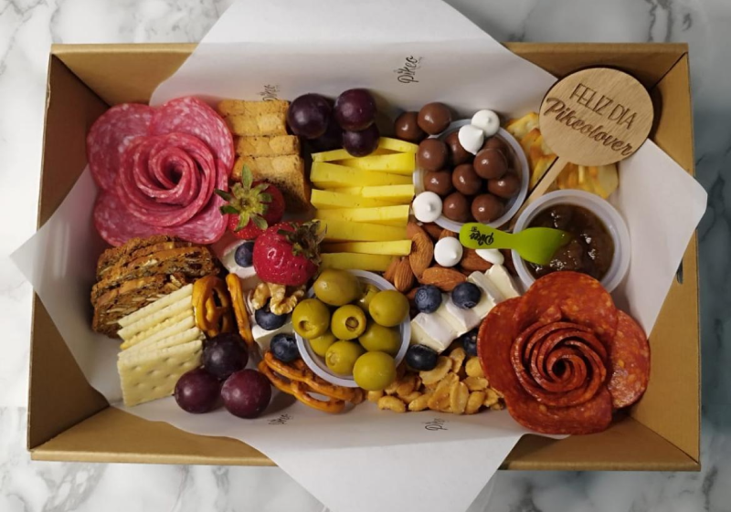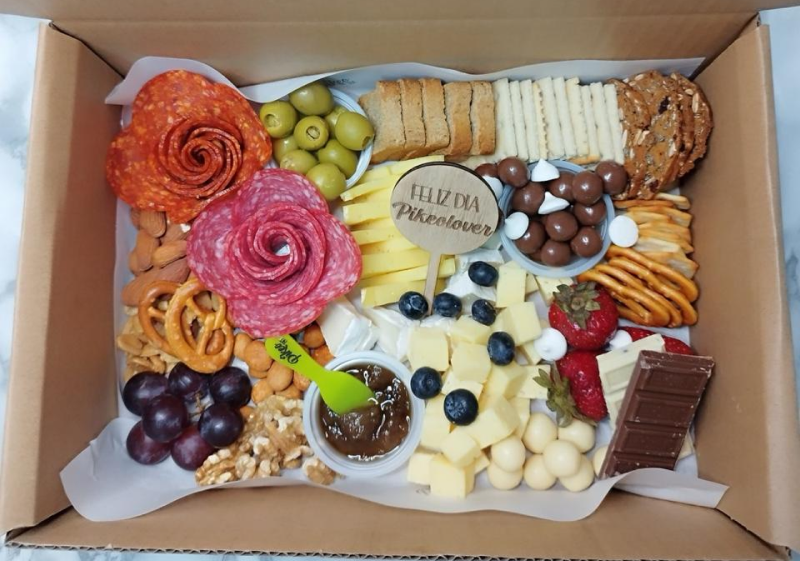 Quesos, salame, pepperoni, jamón serrano, frutos secos, dips untables, galletas saladas, frutas, aceitunas, esferas y cuadritos chocolate, snacks, pretzel