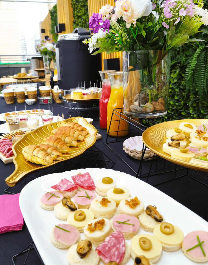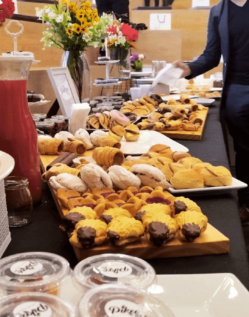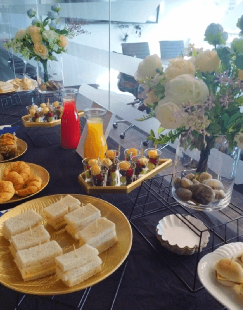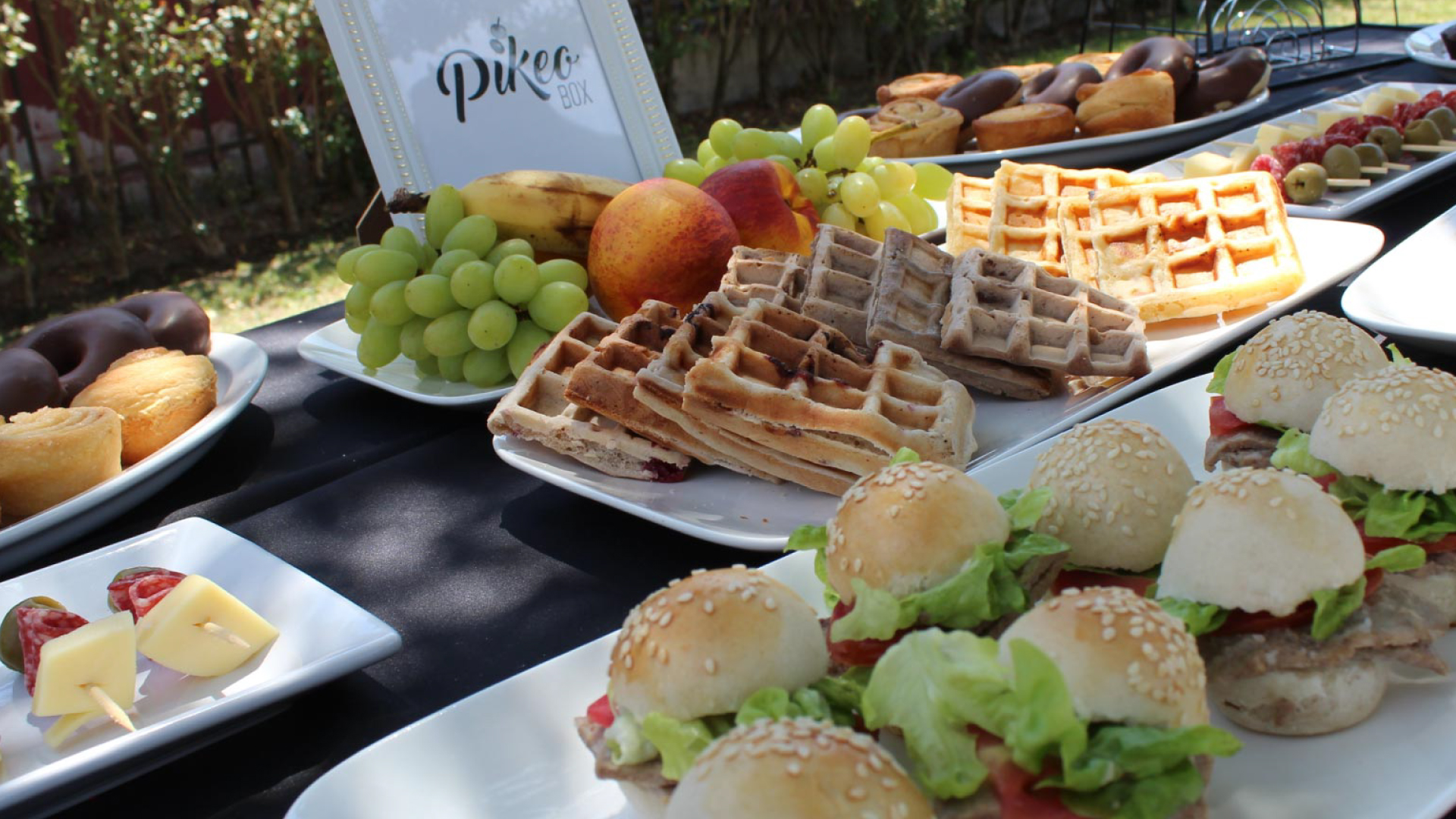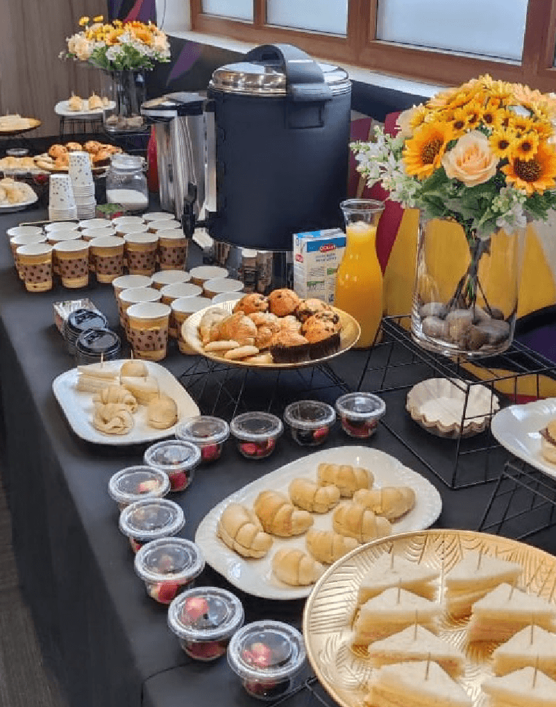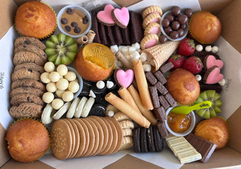 Galletitas y galletones, brownies, variedad de chocolates, magdalenas, marshmellows, dip de manjar, pretzel, fruta de la estación