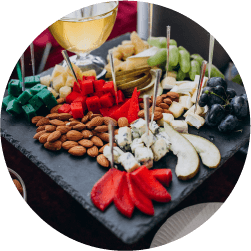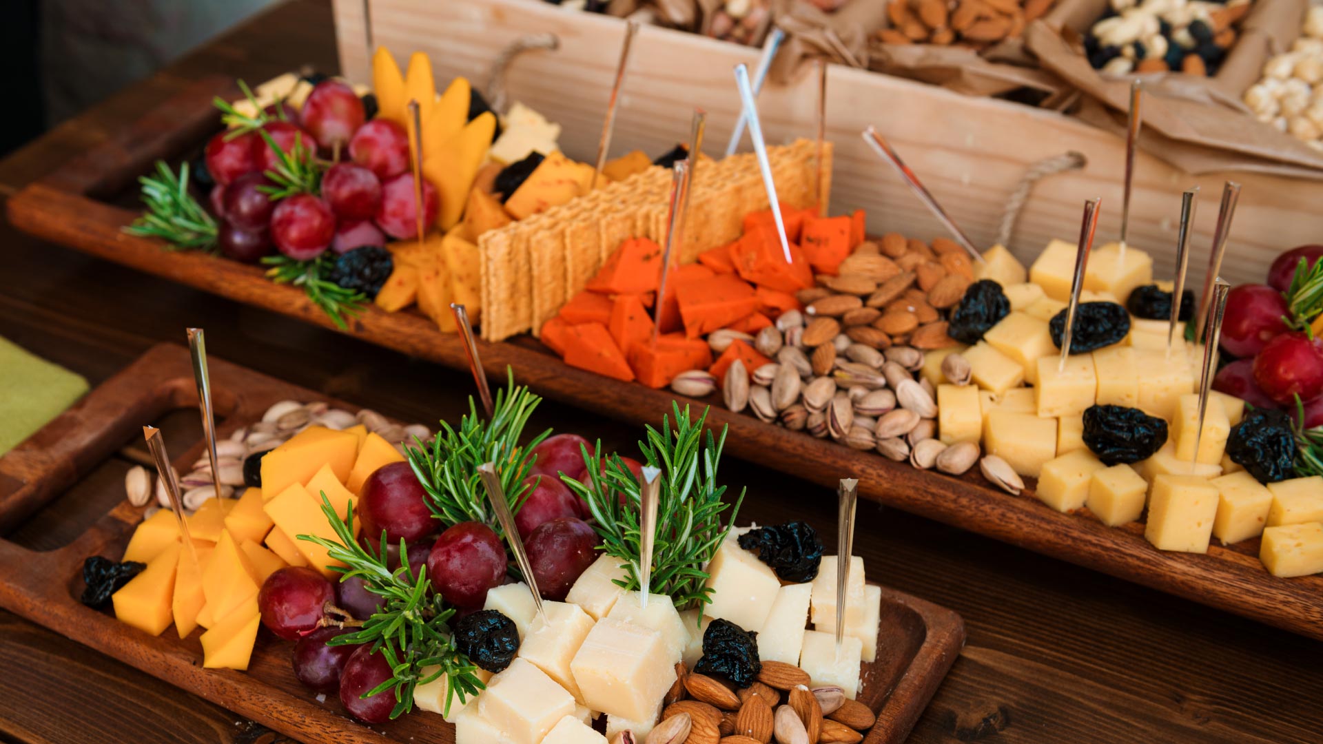 Quesos, salame, pepperoni, frutos secos, dips untables, galletas saladas, frutas de estación, aceitunas, esferas y cuadritos chocolate, snacks, pretzels